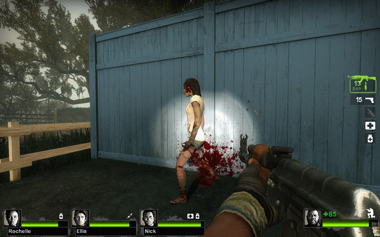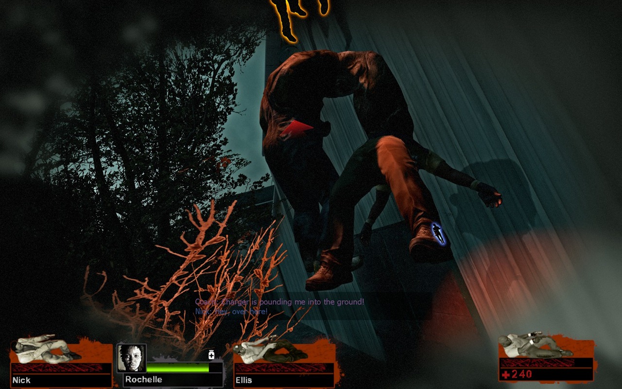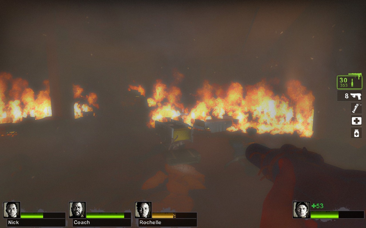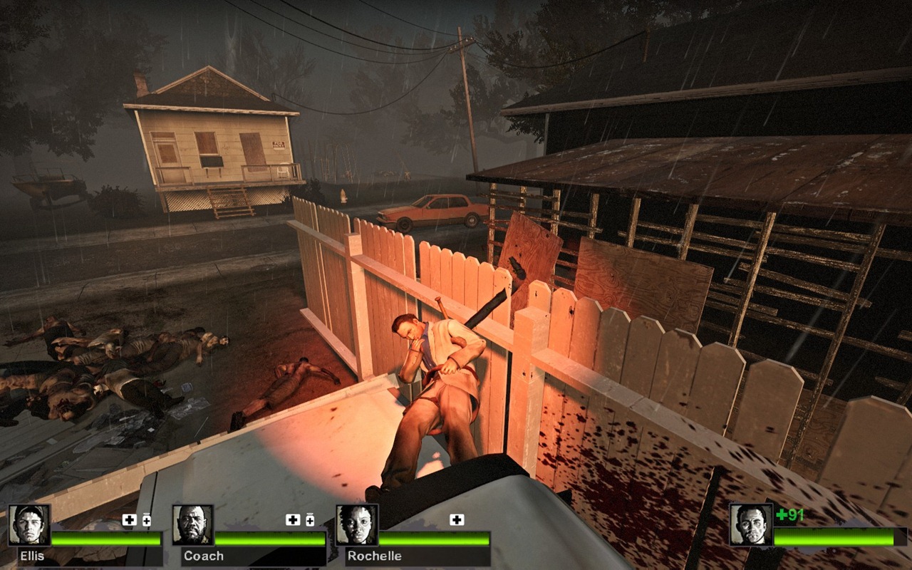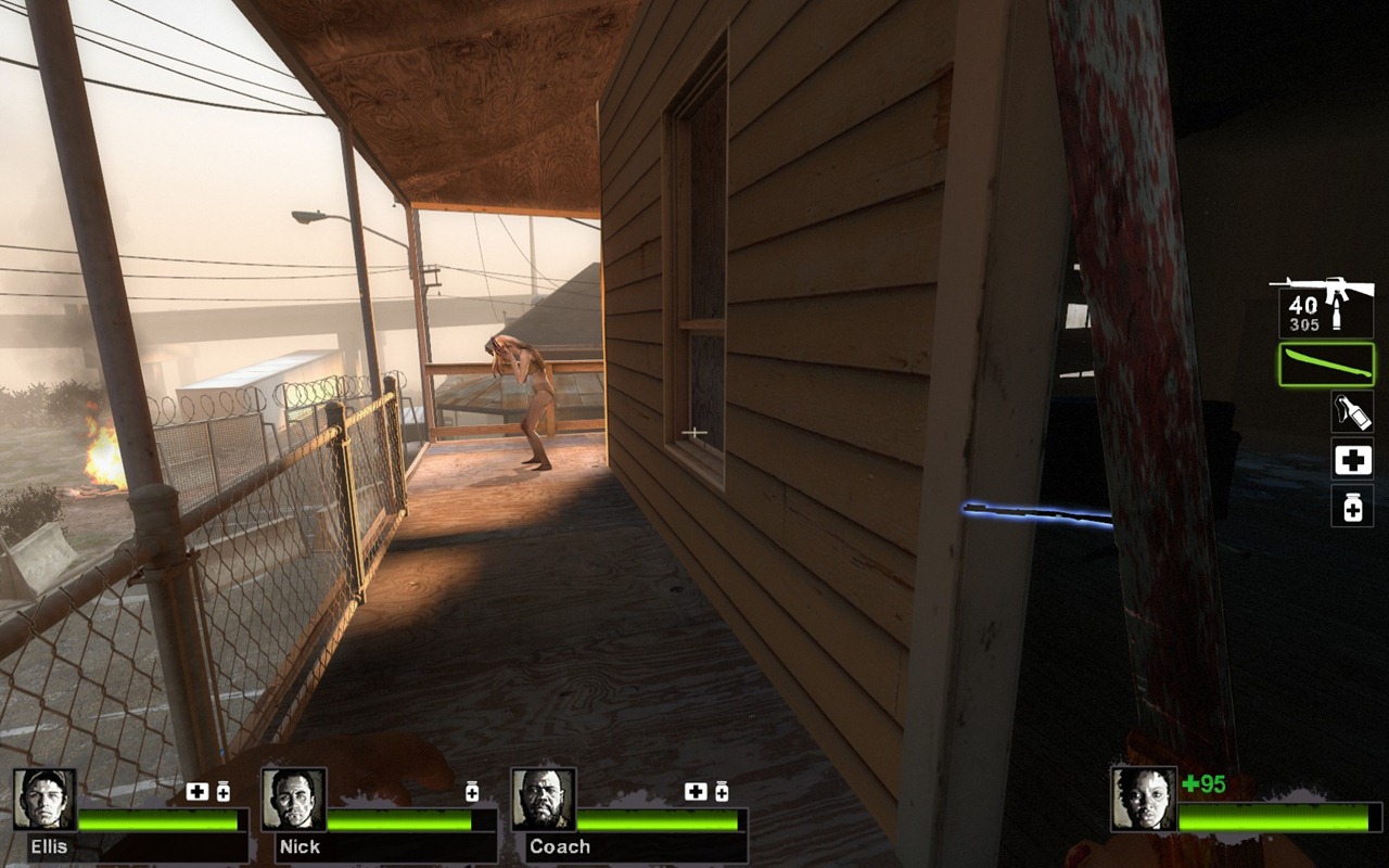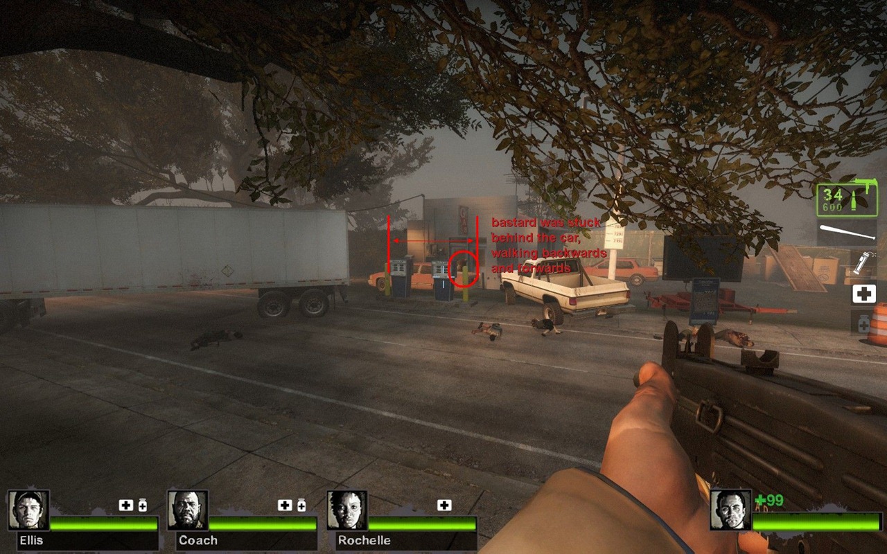 Sometimes few of them doesn’t follow and take a break to watch the stars or jerk off, I don’t know exactly, what the hell they do when they must run for their lives. Situation: everybody were in safe room and Ellis was just standing outside the house, in the middle of the parking lot and guess what, doing nothing! I went and kicked his ass, shot him in the face, but nothing. Then I lured Boomer or Hunter on him and only then, after killing horde and reviving him, he realized, oh, there is a god damn safe-house, where he must go! And there was no Charger to punch him inside the wall, from he cannot break free. Unfortunately I didn’t do any screenshot then…