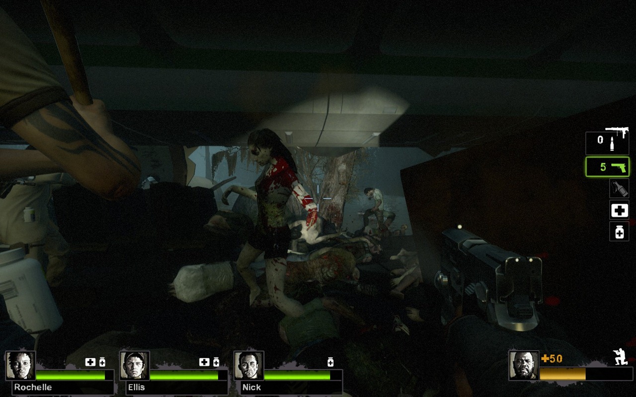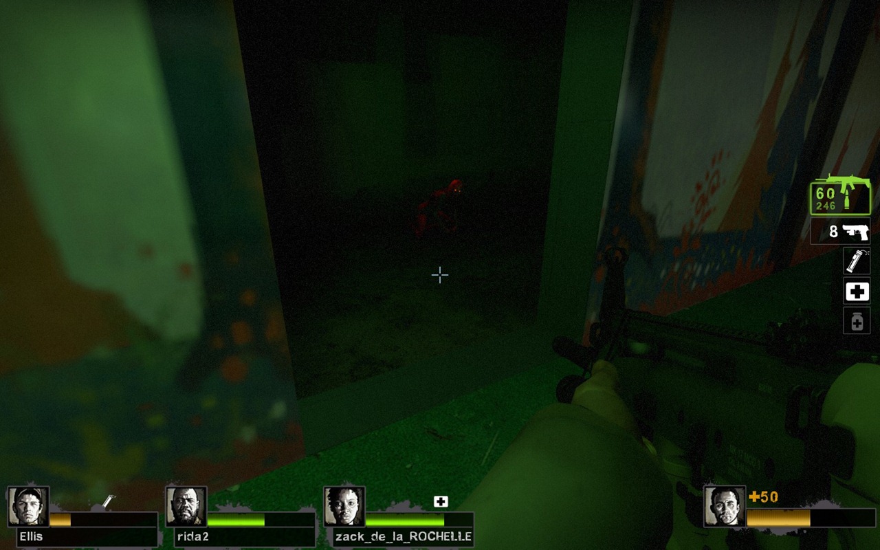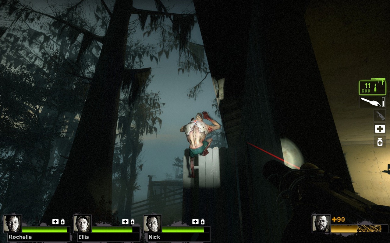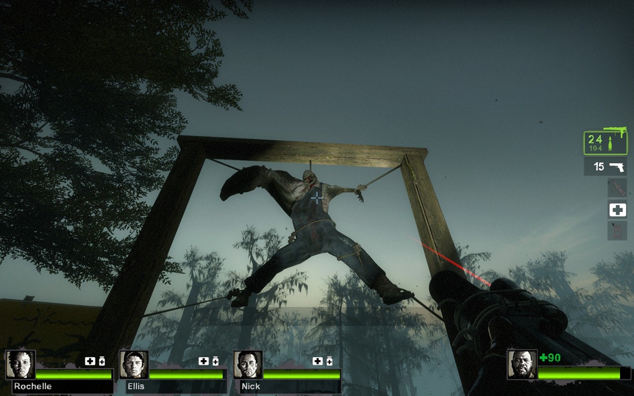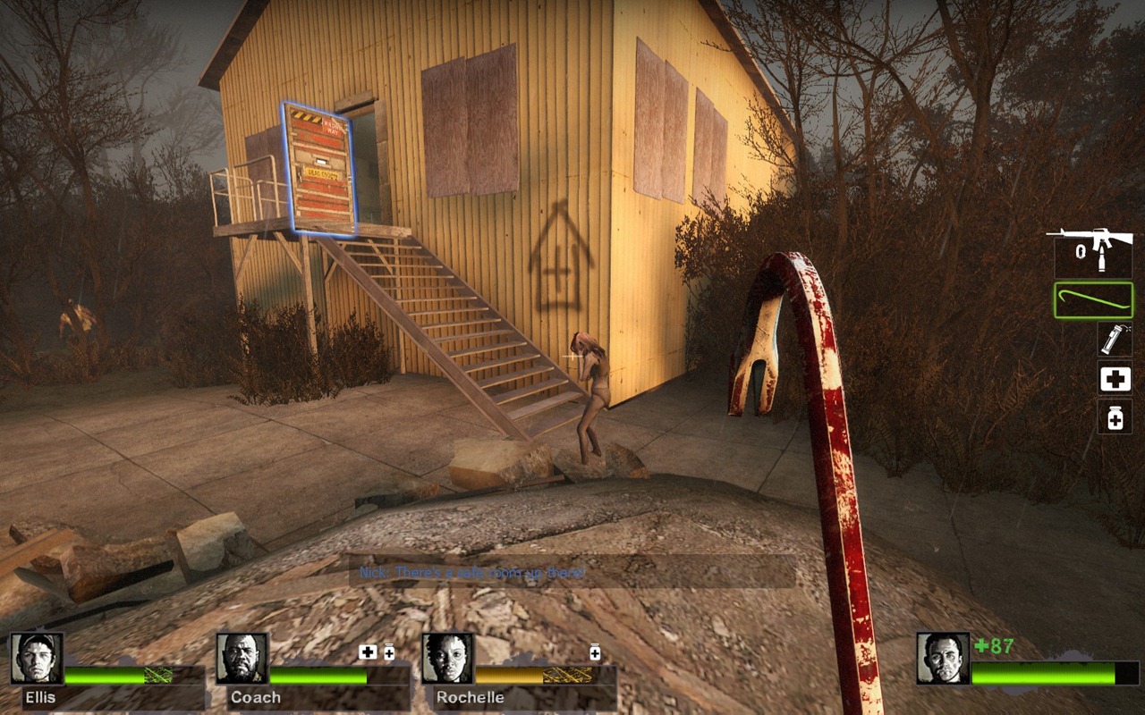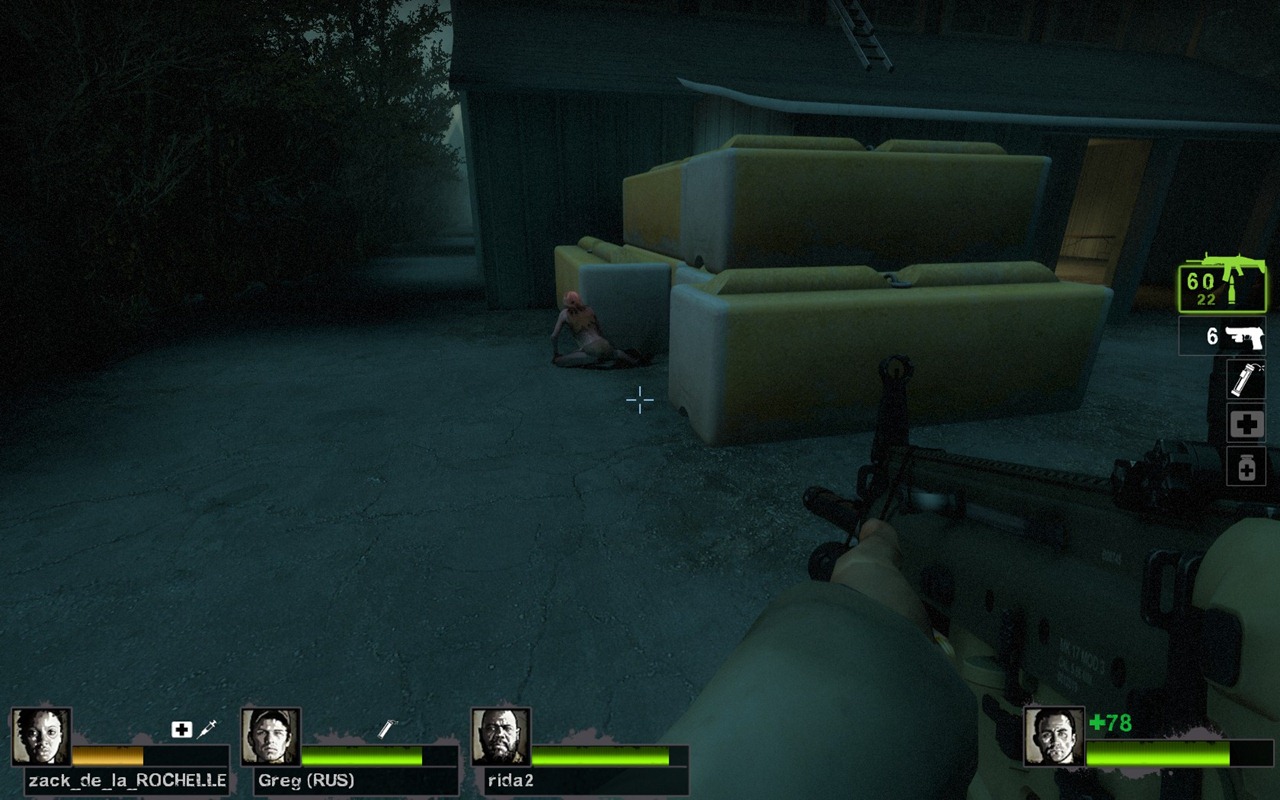 Sometimes few of them doesn’t follow and take a break to watch the stars or jerk off, I don’t know exactly, what the hell they do when they must run for their lives. Situation: everybody were in safe room and Ellis was just standing outside the house, in the middle of the parking lot and guess what, doing nothing! I went and kicked his ass, shot him in the face, but nothing. Then I lured Boomer or Hunter on him and only then, after killing horde and reviving him, he realized, oh, there is a god damn safe-house, where he must go! And there was no Charger to punch him inside the wall, from he cannot break free. Unfortunately I didn’t do any screenshot then…