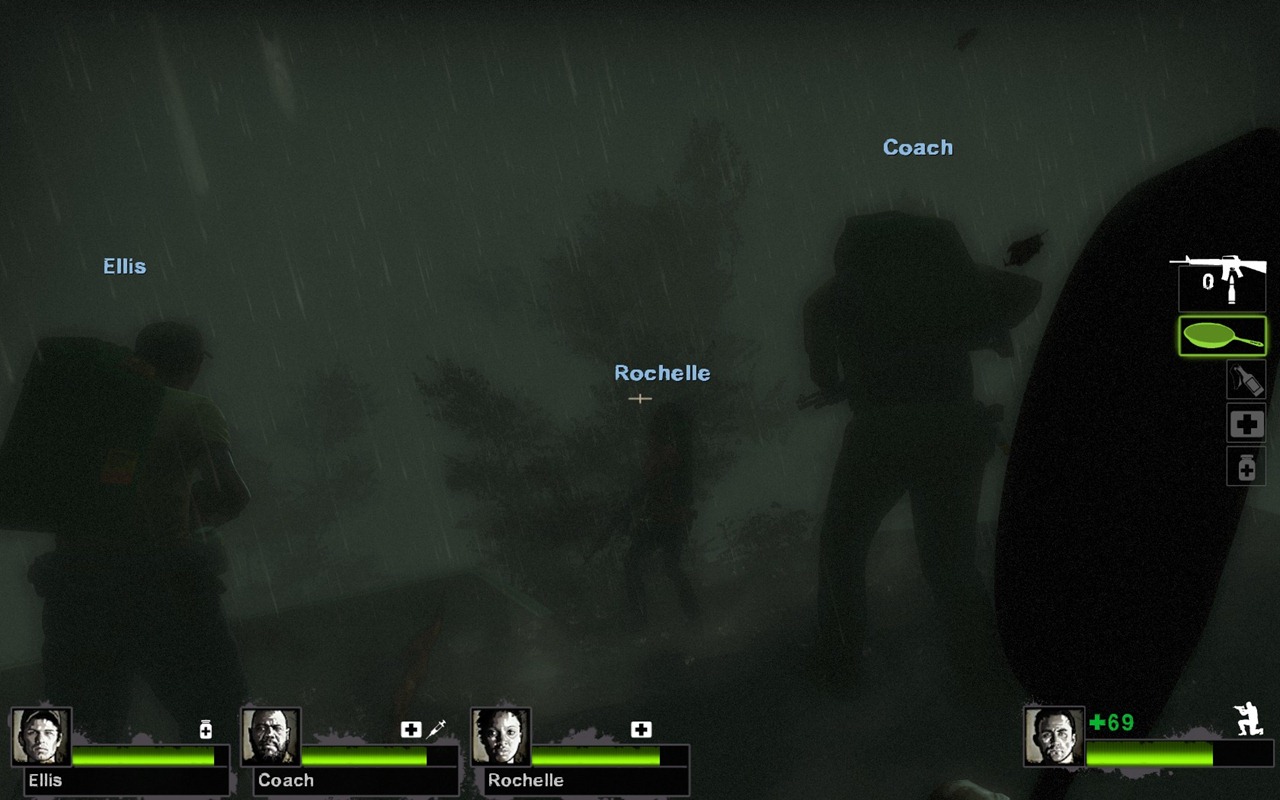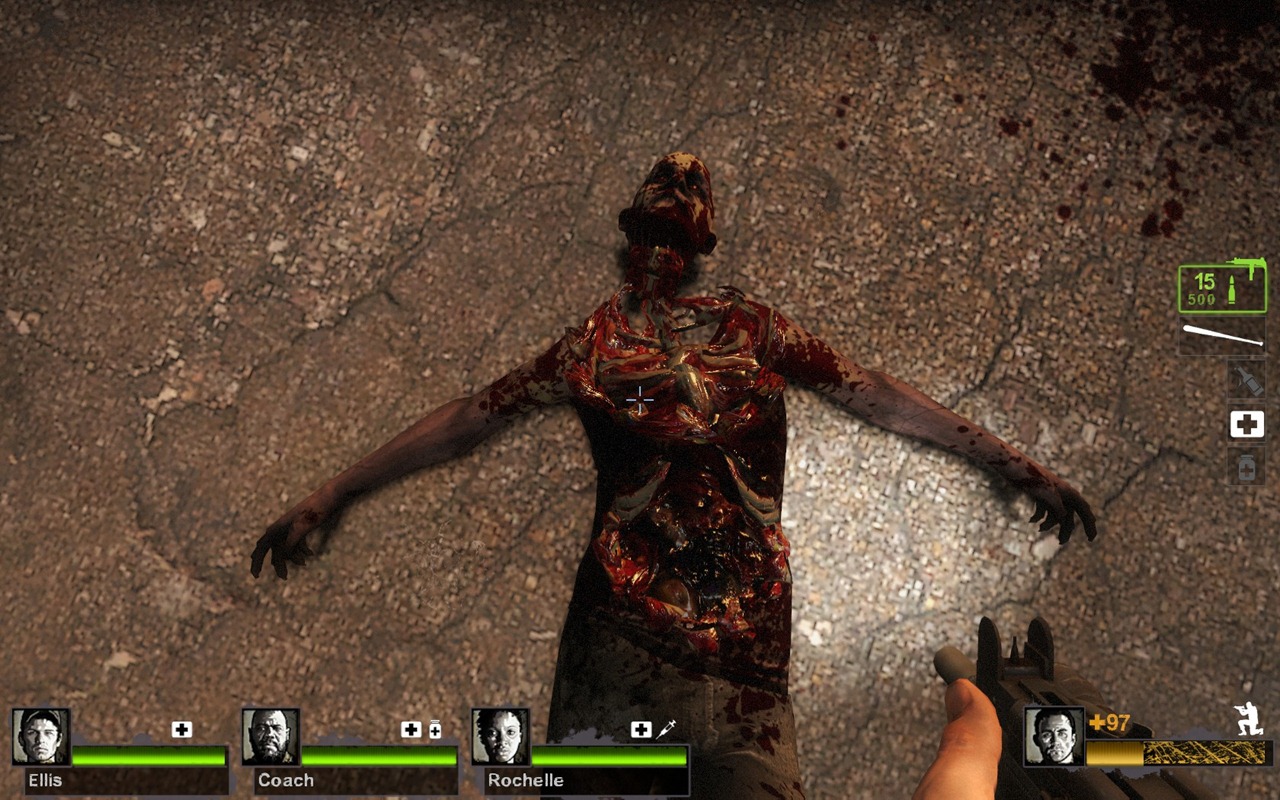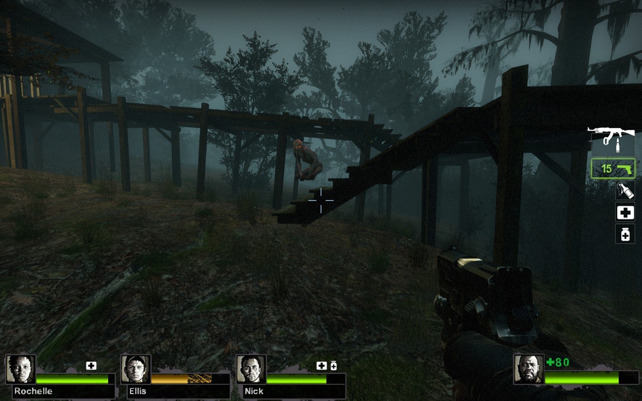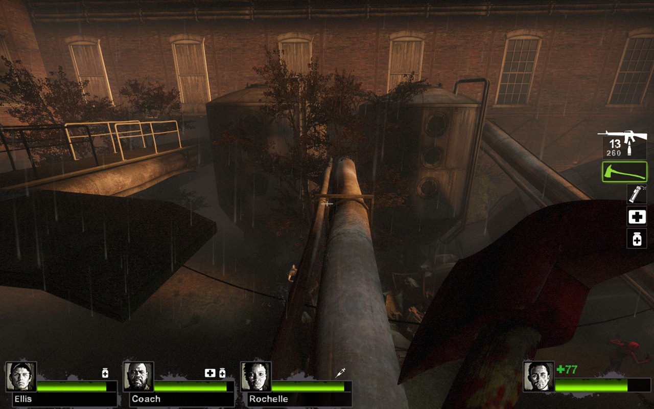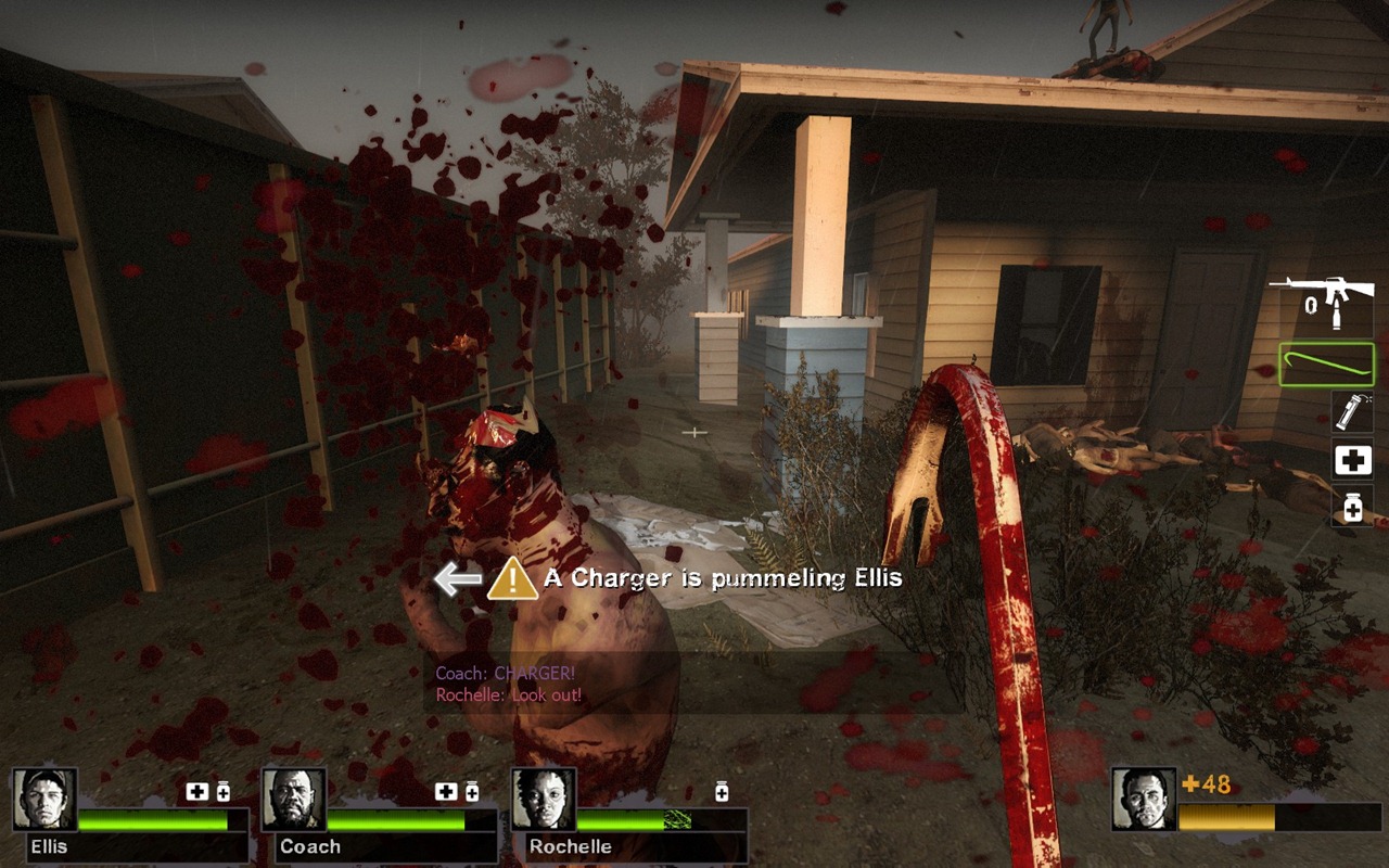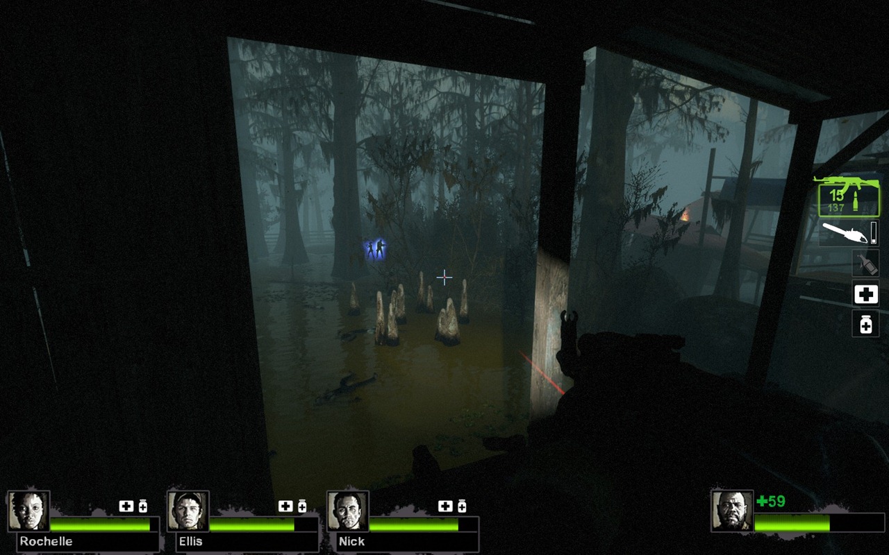 Sometimes few of them doesn’t follow and take a break to watch the stars or jerk off, I don’t know exactly, what the hell they do when they must run for their lives. Situation: everybody were in safe room and Ellis was just standing outside the house, in the middle of the parking lot and guess what, doing nothing! I went and kicked his ass, shot him in the face, but nothing. Then I lured Boomer or Hunter on him and only then, after killing horde and reviving him, he realized, oh, there is a god damn safe-house, where he must go! And there was no Charger to punch him inside the wall, from he cannot break free. Unfortunately I didn’t do any screenshot then…