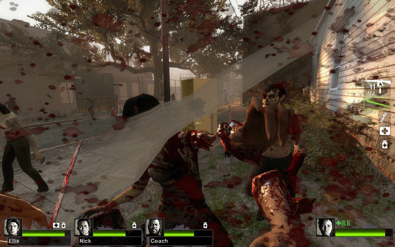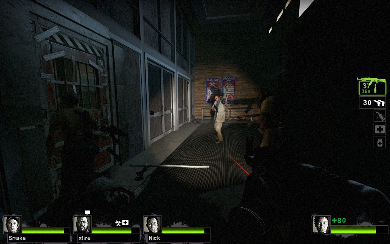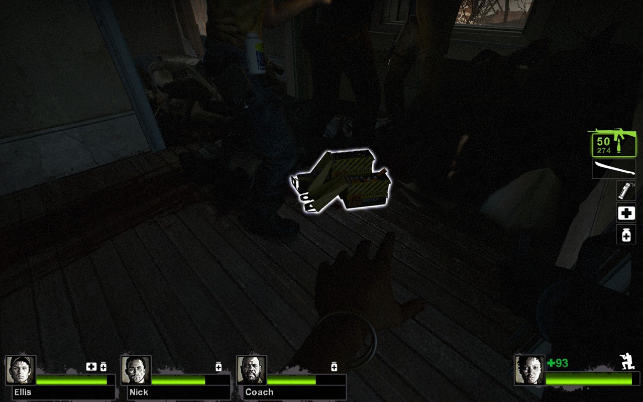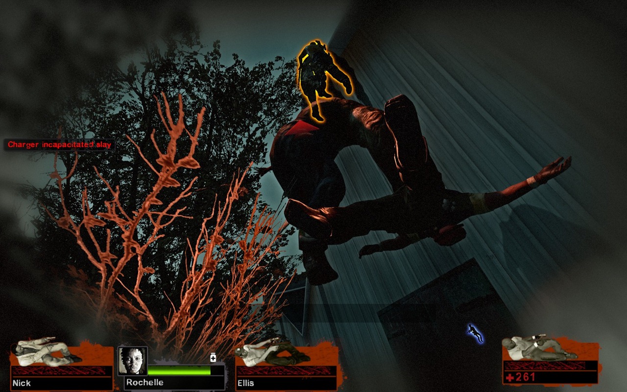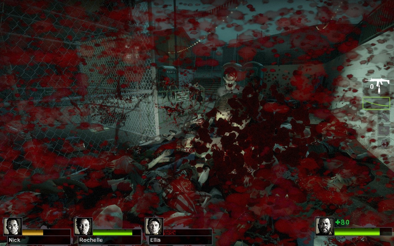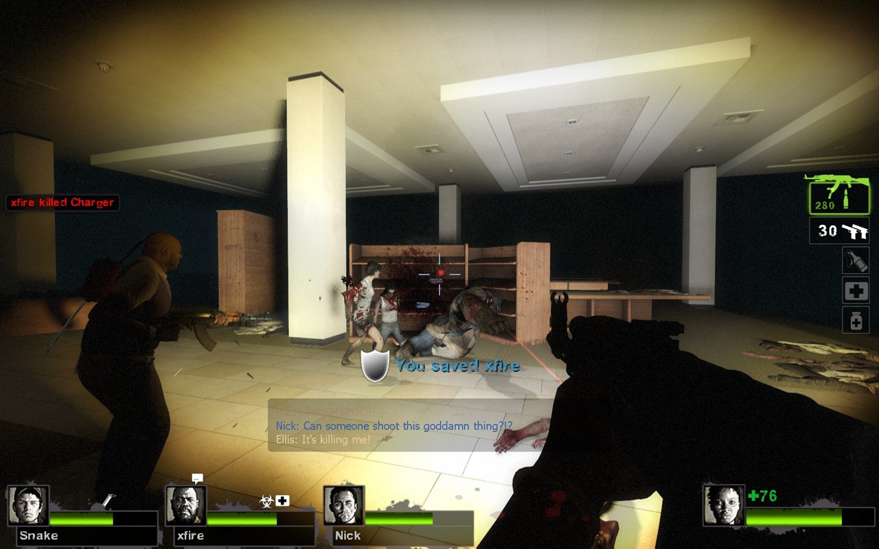 Sometimes few of them doesn’t follow and take a break to watch the stars or jerk off, I don’t know exactly, what the hell they do when they must run for their lives. Situation: everybody were in safe room and Ellis was just standing outside the house, in the middle of the parking lot and guess what, doing nothing! I went and kicked his ass, shot him in the face, but nothing. Then I lured Boomer or Hunter on him and only then, after killing horde and reviving him, he realized, oh, there is a god damn safe-house, where he must go! And there was no Charger to punch him inside the wall, from he cannot break free. Unfortunately I didn’t do any screenshot then…