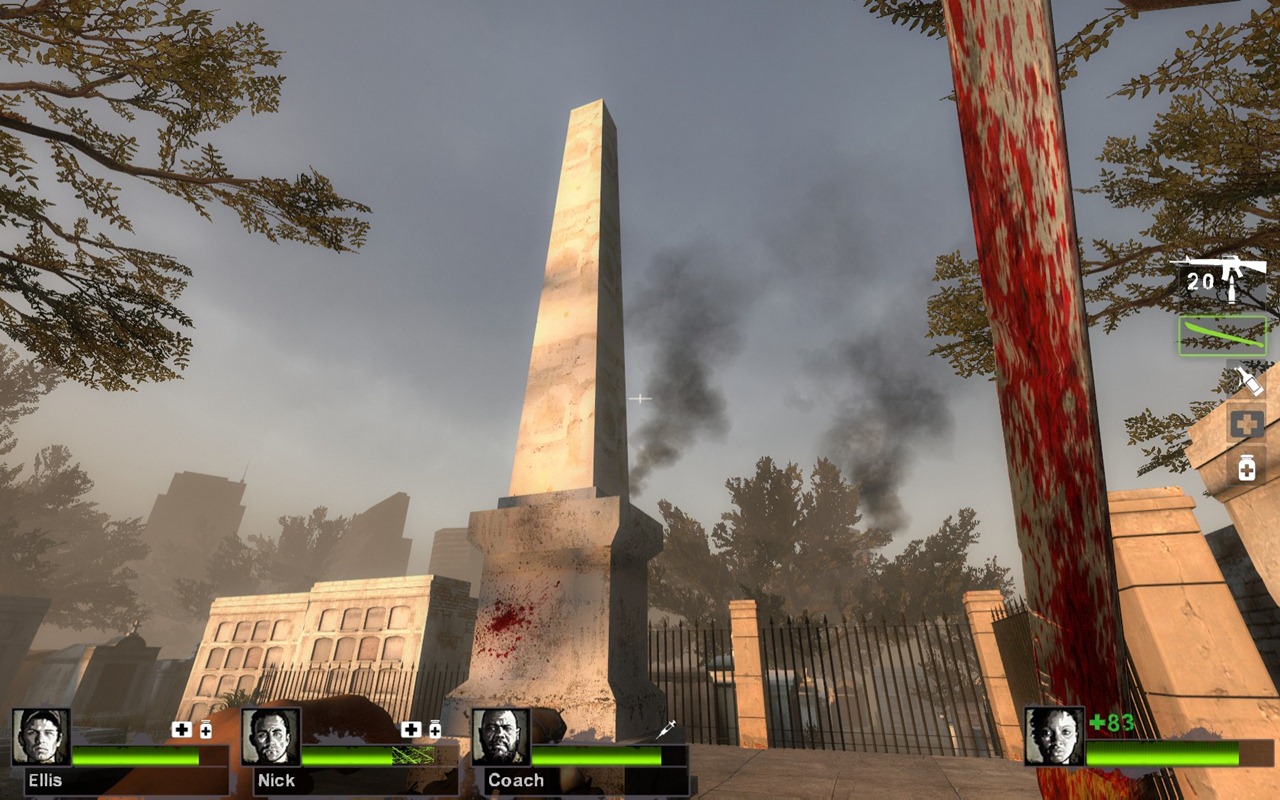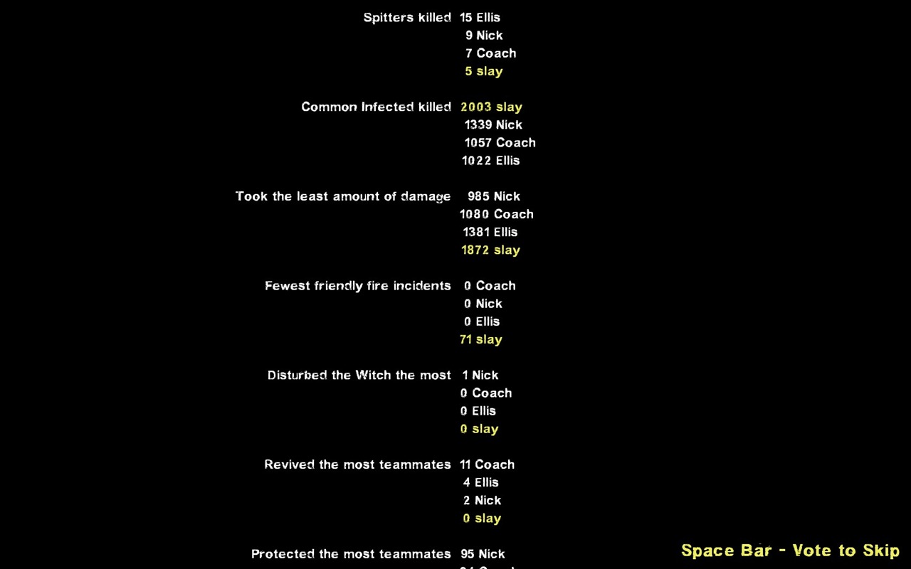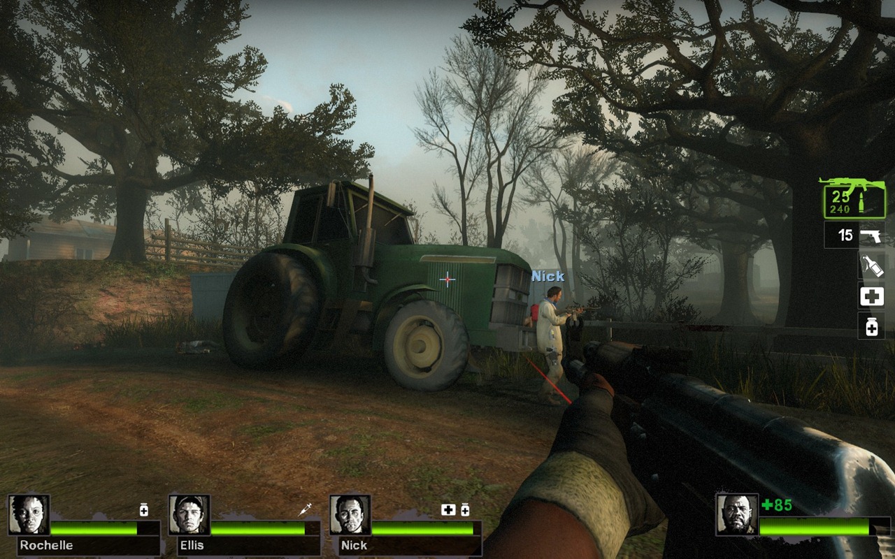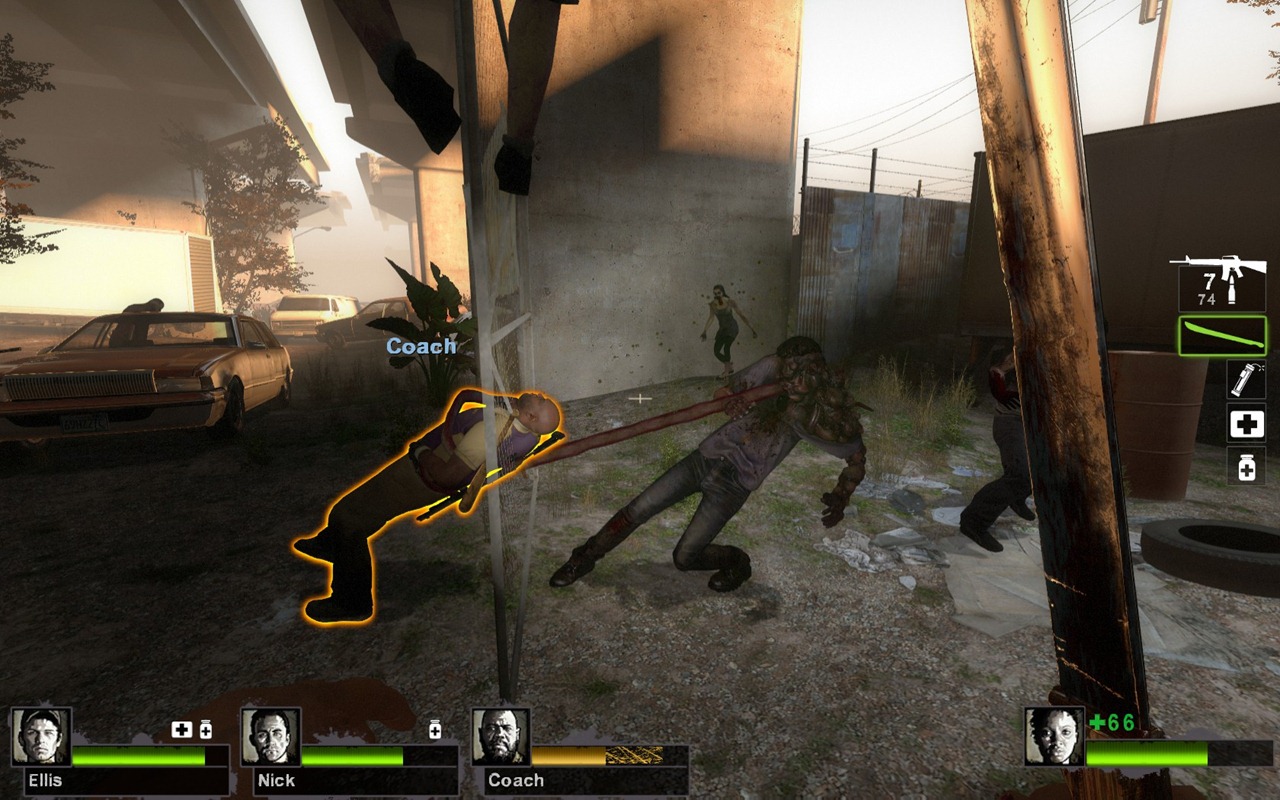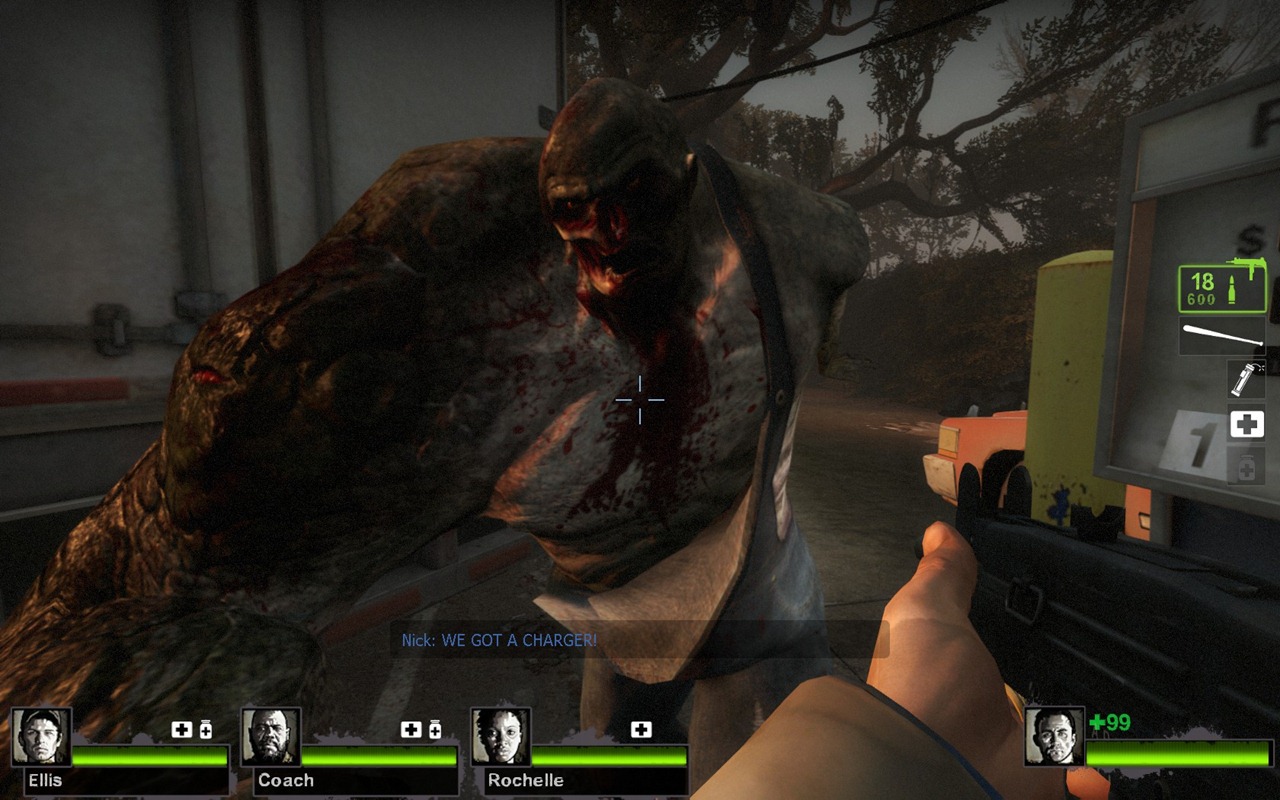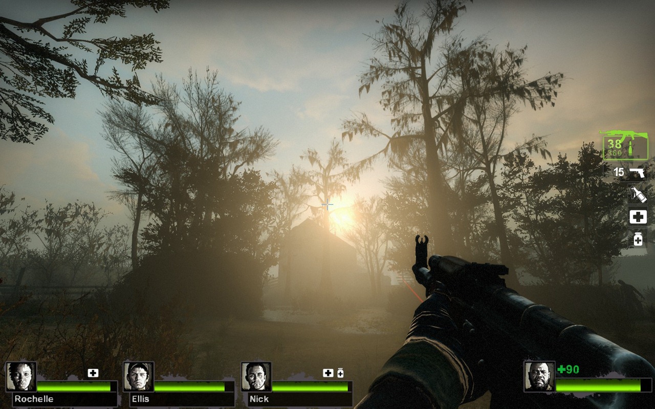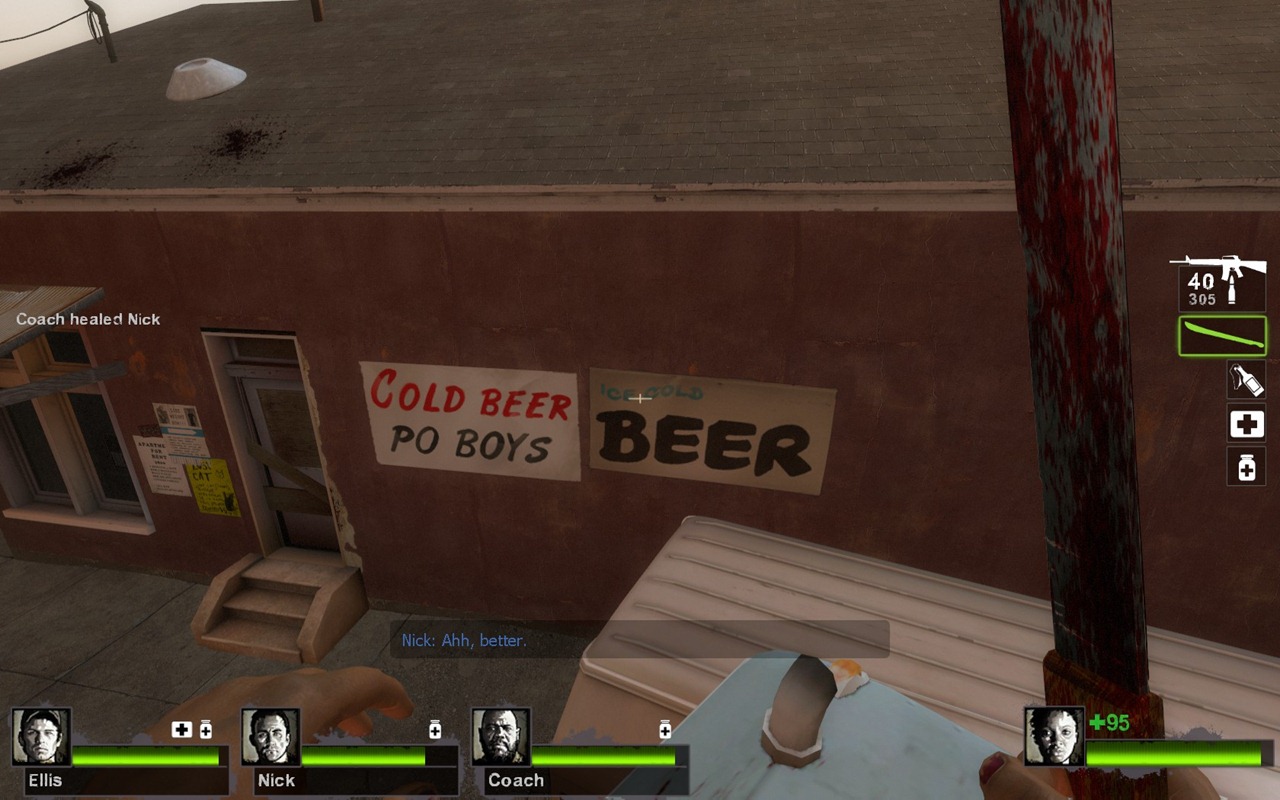 Sometimes few of them doesn’t follow and take a break to watch the stars or jerk off, I don’t know exactly, what the hell they do when they must run for their lives. Situation: everybody were in safe room and Ellis was just standing outside the house, in the middle of the parking lot and guess what, doing nothing! I went and kicked his ass, shot him in the face, but nothing. Then I lured Boomer or Hunter on him and only then, after killing horde and reviving him, he realized, oh, there is a god damn safe-house, where he must go! And there was no Charger to punch him inside the wall, from he cannot break free. Unfortunately I didn’t do any screenshot then…