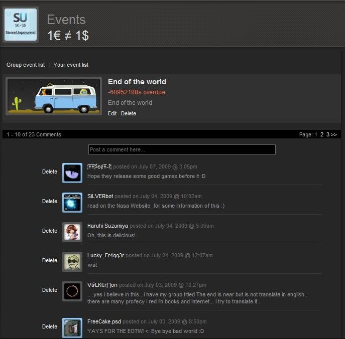 Steam community problem started with Steam bug, which corrupted event and spammed users every time the logged in. We lost 100 users or so. Screenshots were made (as seen below in this post) and ticket to Steam was made. Steam realized 2 days later that there is glitch with event and changed status from public to private, so people can’t join and receive event-spam. Quoting: