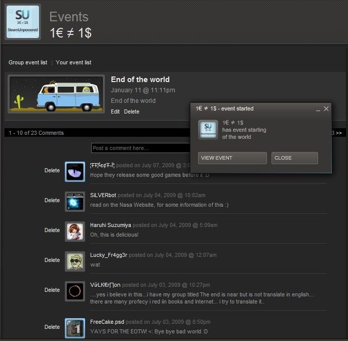 * Very frustrating for steam community users were one humor event of end of the world event (22. Dec 2012). And it started to spam users time they log on. It was steam event bug and it didn’t go away even, when to put November in this year. But it could just be Steam bug. As I got answer from Walter 4 days later, on 20th December, where he suspected that event “may have become corrupted”. Deletion really worked, but we lost hundreds of users who were pissed off at it.